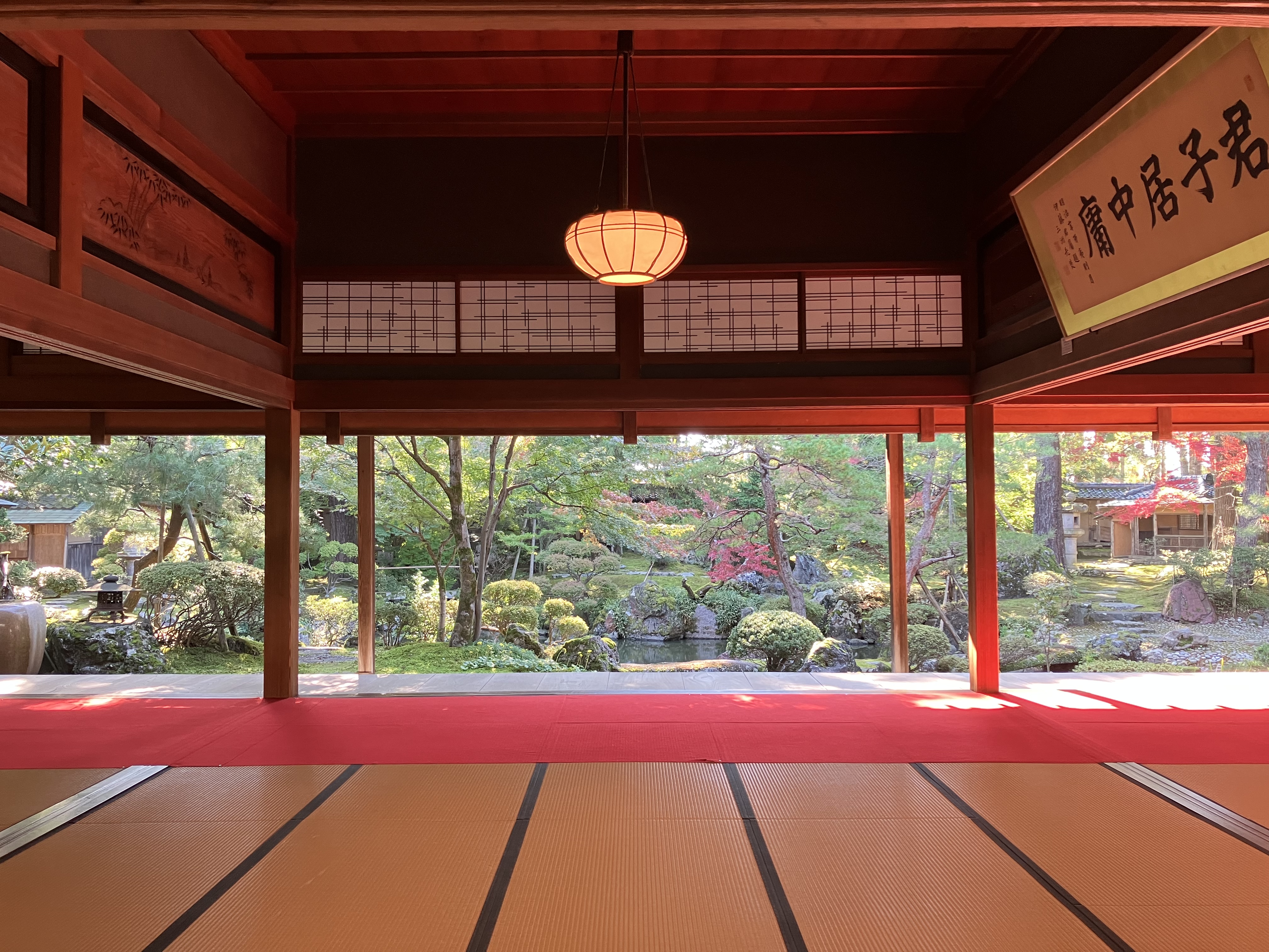 毛氈に朝日が反射して部屋全体が紅いです。紅葉の初めは紅が際立ち、後半は黄やオレンジが混ざって華やかになります。雨戸を開け放っています。暖かい服装でお越し下さい。(写真 10月30日)