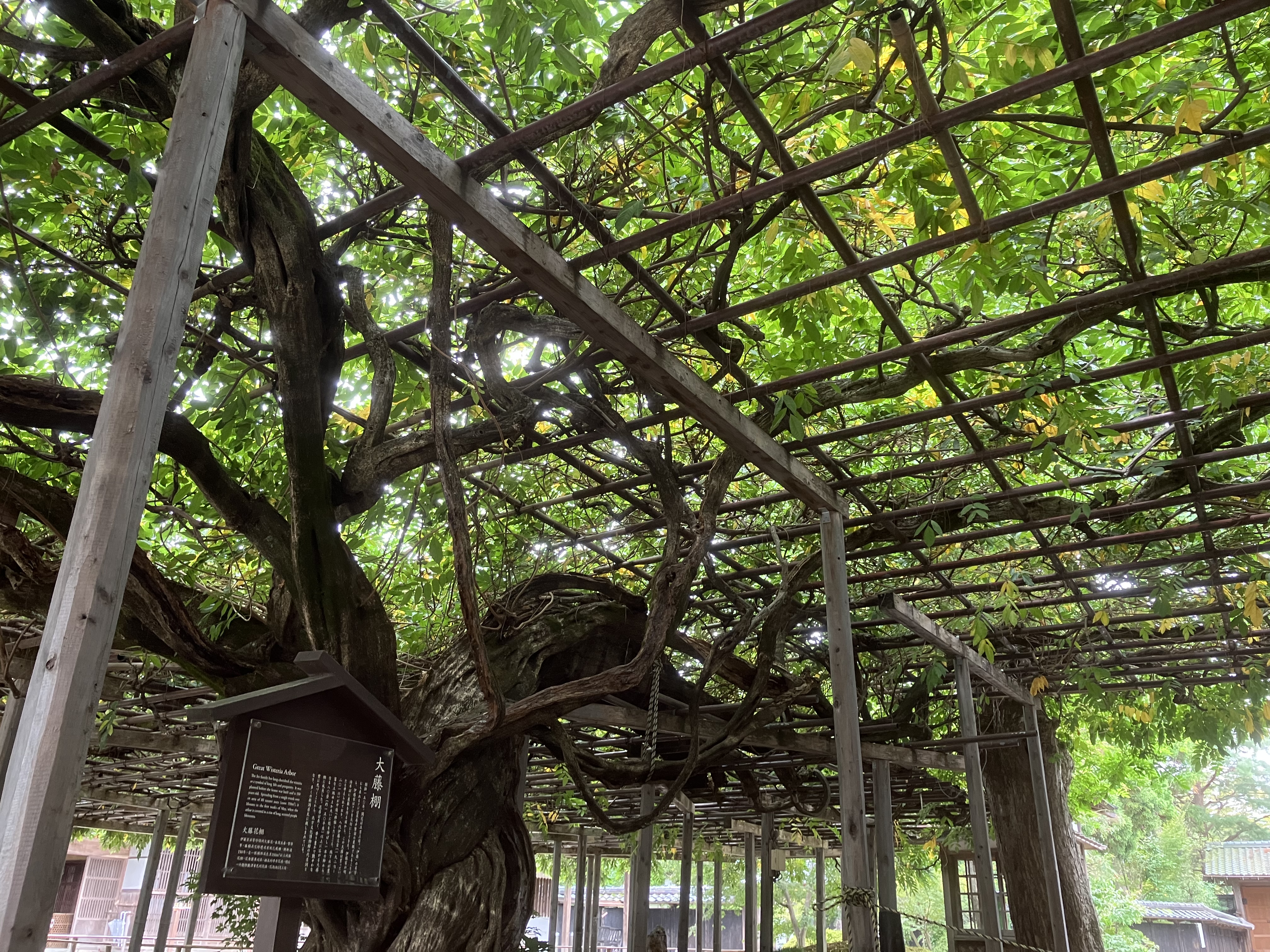 場所によりモミジの色づきもちらほら。藤棚は緑と黄色の葉でミックス模様。(写真 10月14日)