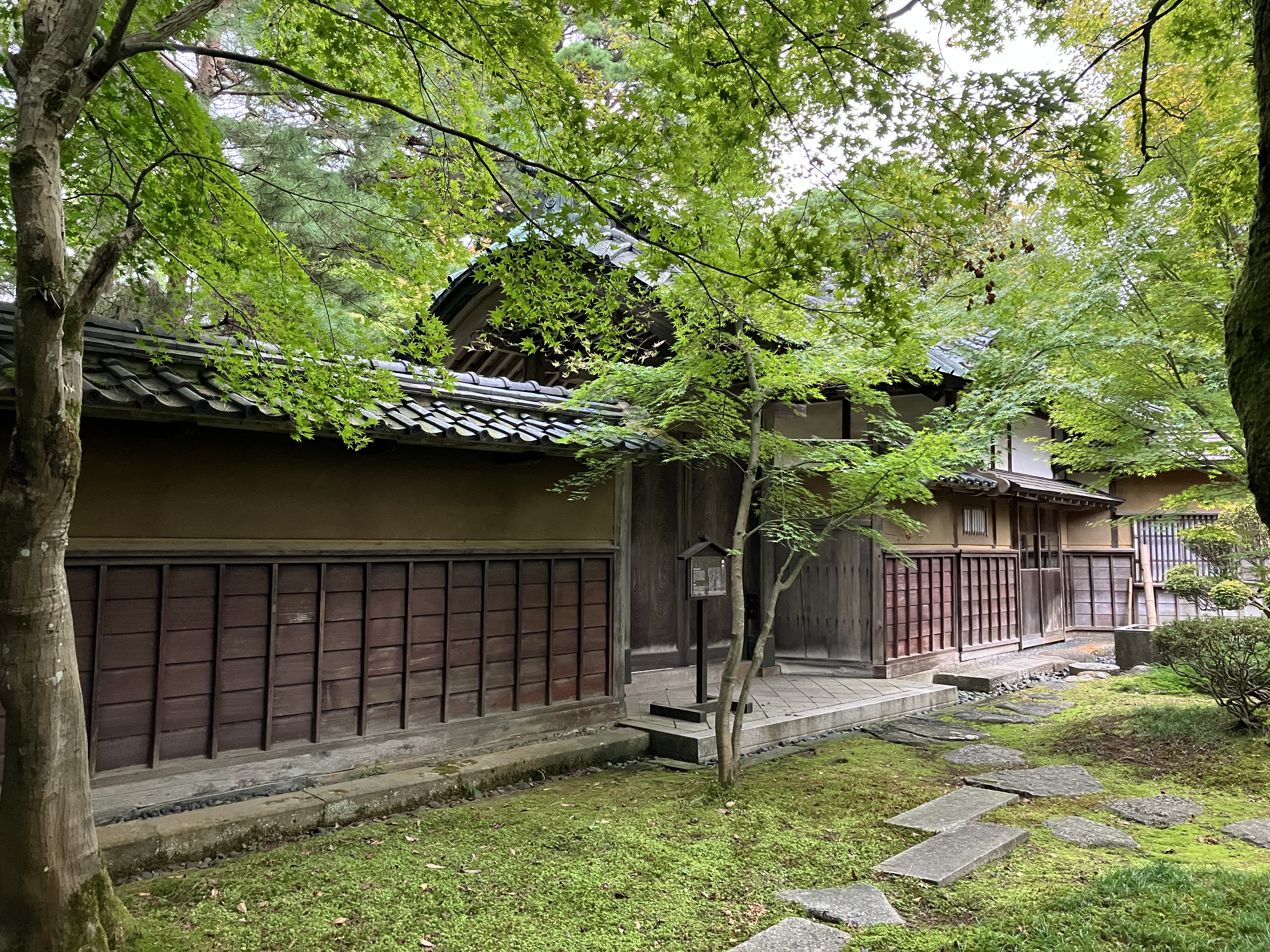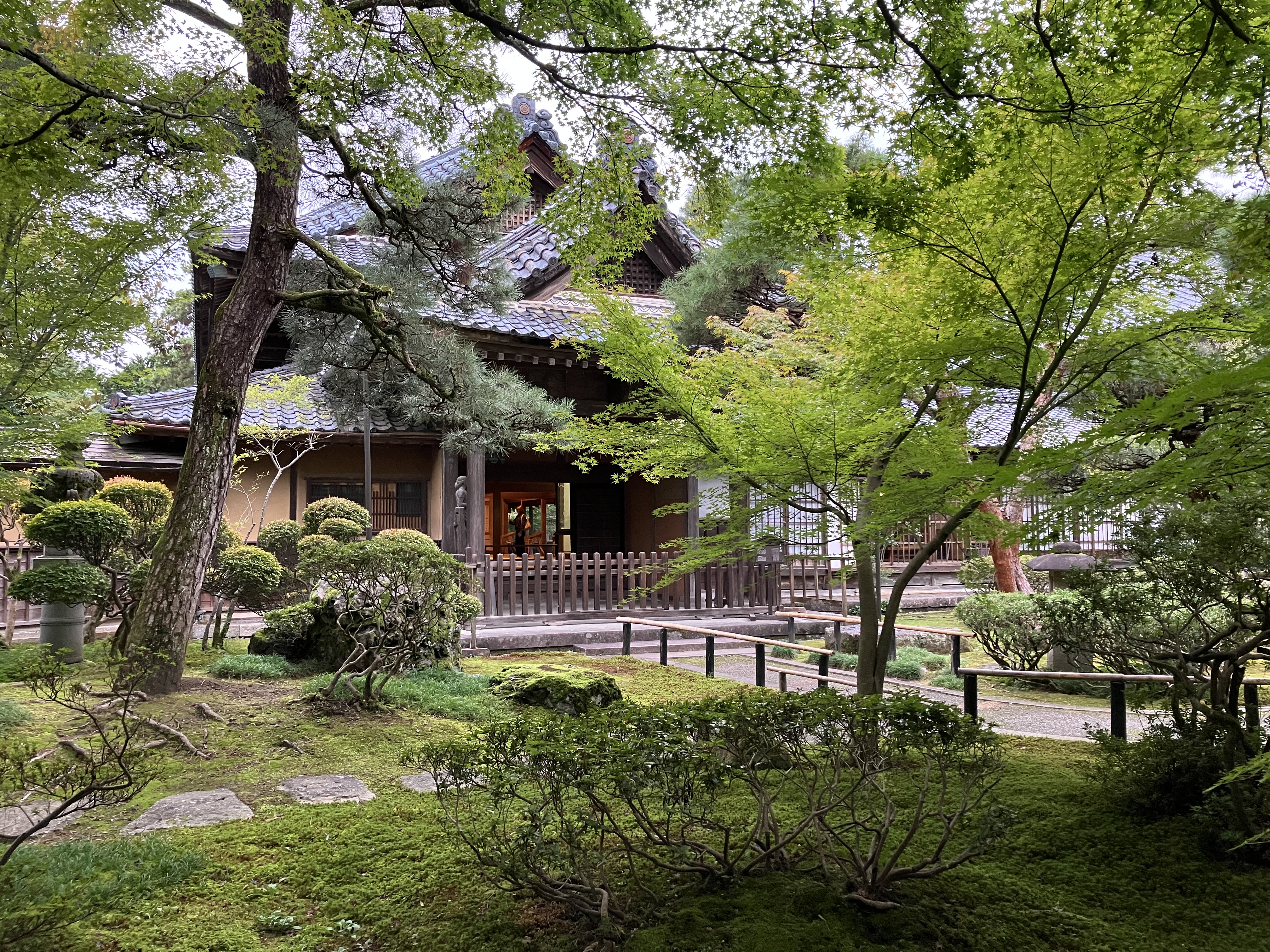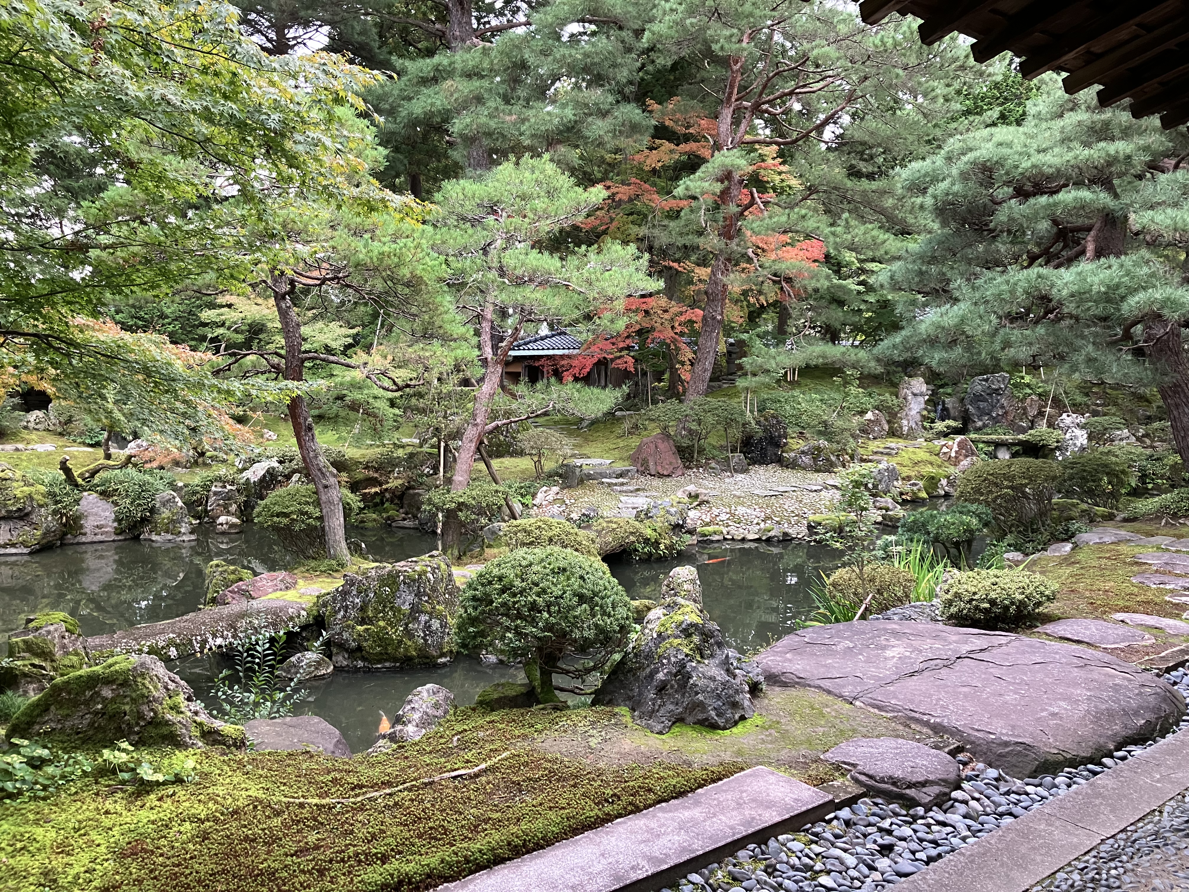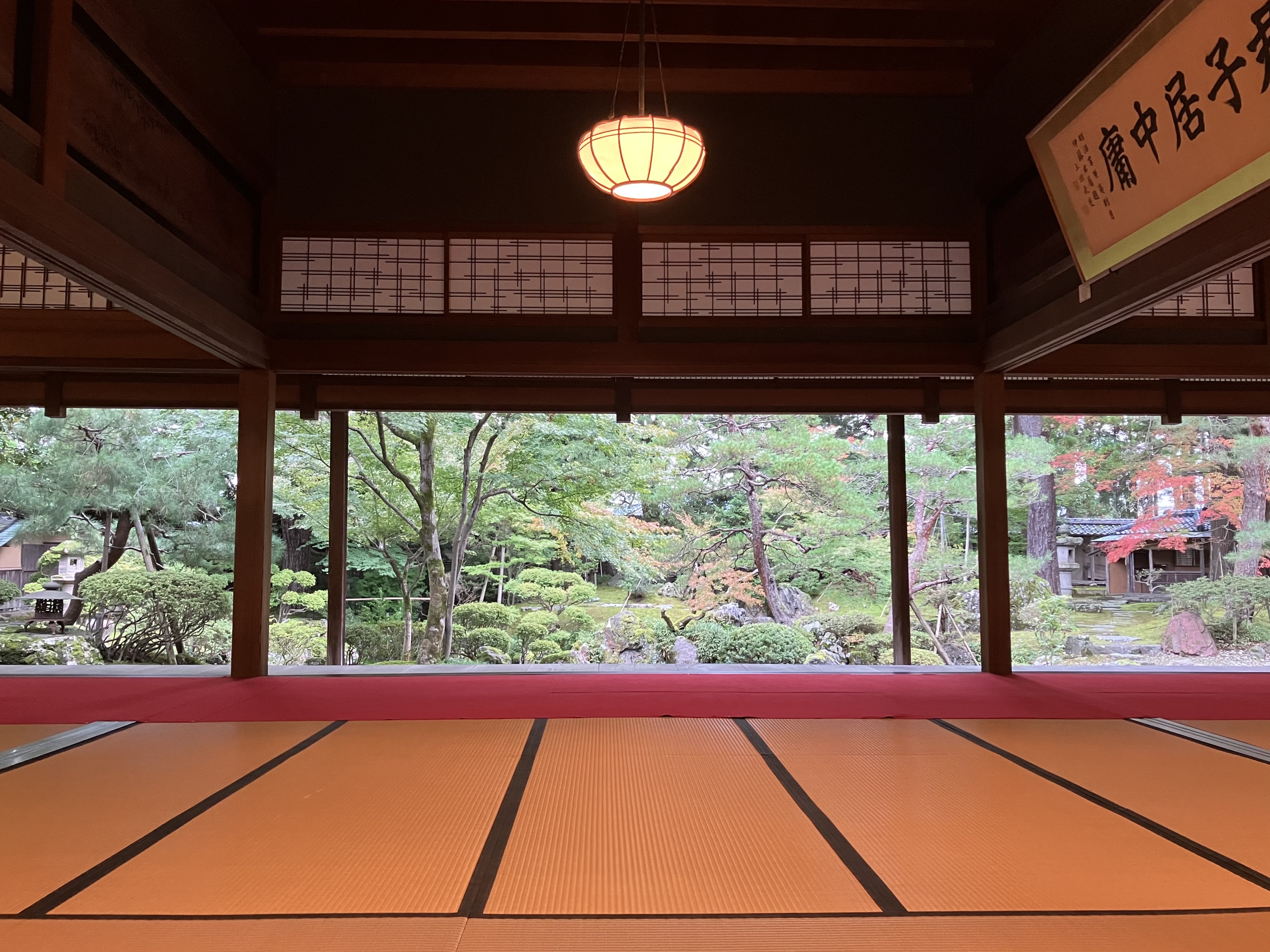 大庭の右奥のモミジが鮮やかです。大玄関前はまだまだ青いです。最高気温が20℃を下回るようになりました。上着を持ってお越しください。(写真 10月19日)
