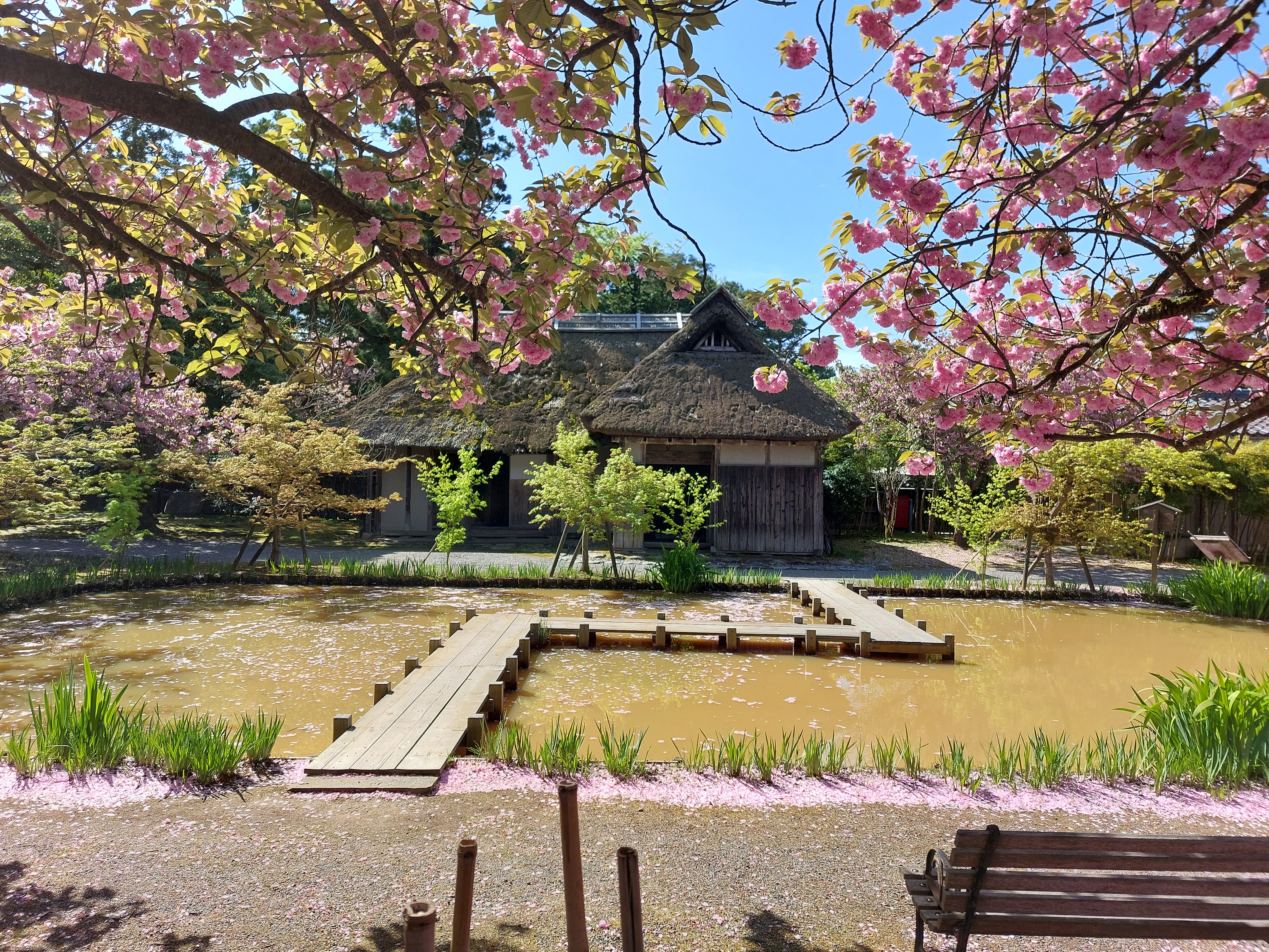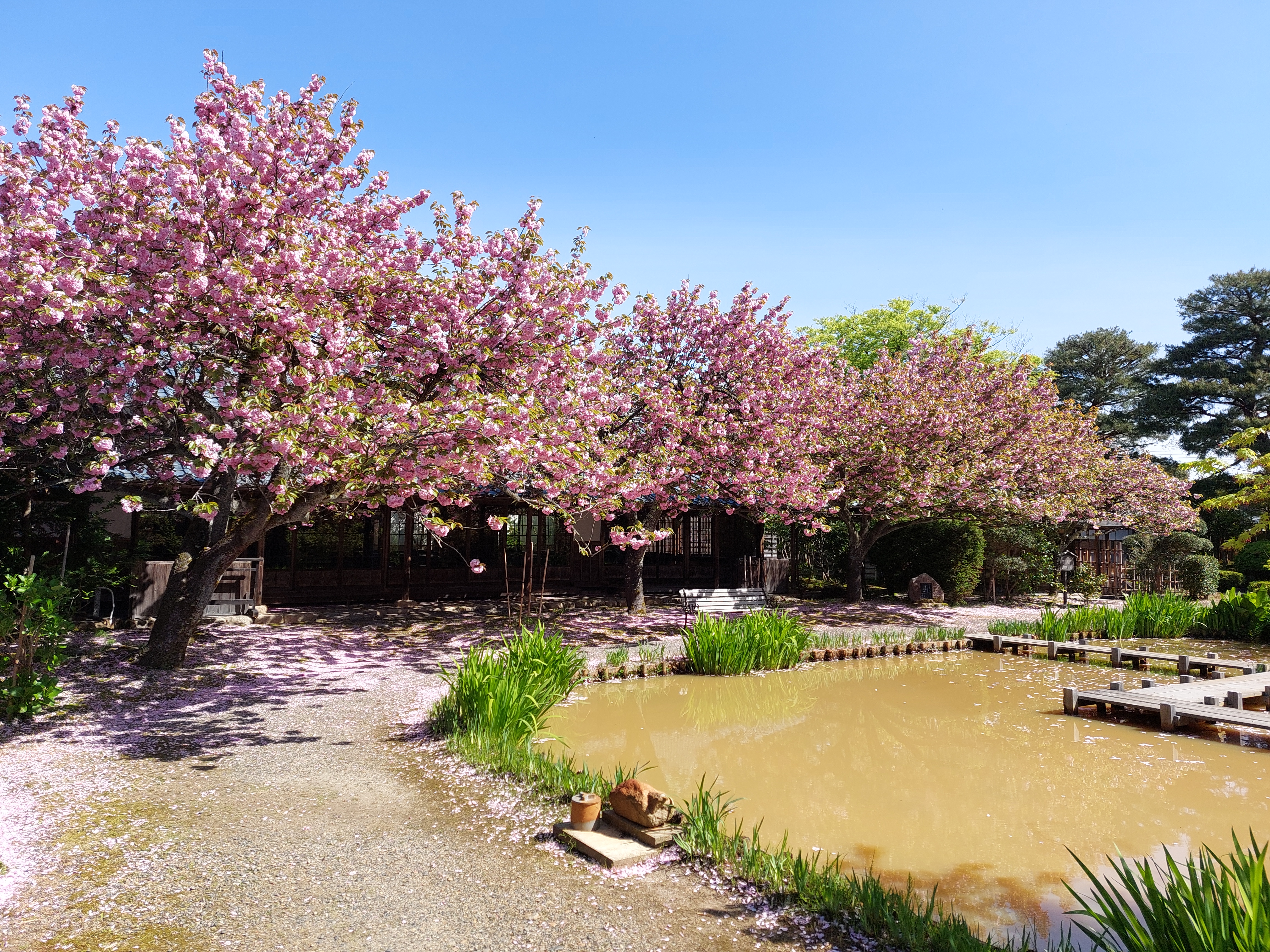 2026年4月3日 ~桜のご案内~ ○八重桜(古民家のまわり)(写真 4月22日)散り始めてきました。 散った花びらでピンクの絨毯が少しずつ出来てきました。 ○枝垂れ桜(集古館の裏) 見頃は終わりました ○ソメイヨシノ(西門広場) 見頃は終わりました ※園内は整備中の箇所がございます。ご理解・ご協力をお願いいたします。 ← 大藤棚&八藤園ライトアップ2026 光越窯の器展 4/25~29 (西門広場) →