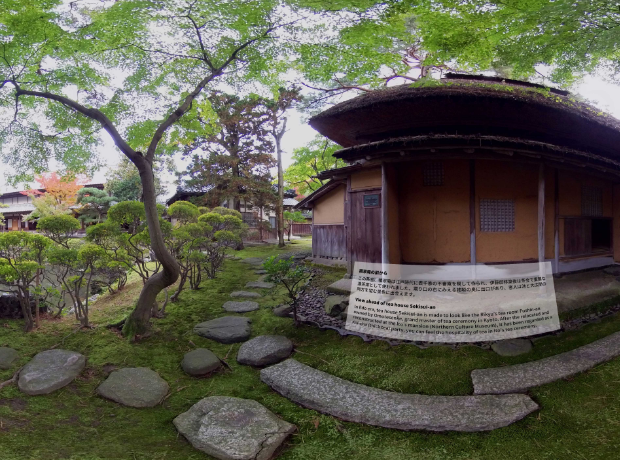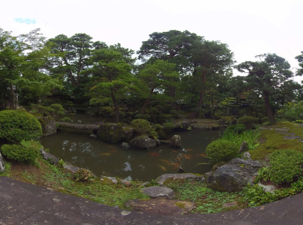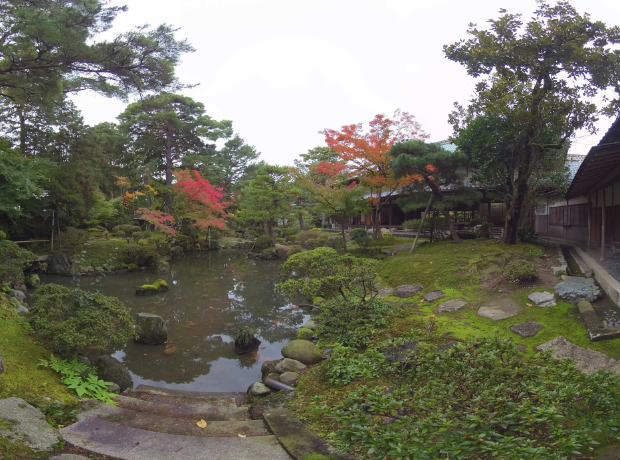 中央池泉に各地の名石を配した、鎌倉・室町の古式によって造られた回遊式庭園です。庭園内には5つの茶室が点在します。この庭は、京都・銀閣寺ゆかりの庭師田中泰阿弥(新潟県柏崎市出身)により5年がかりで造られました。