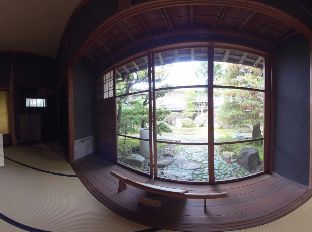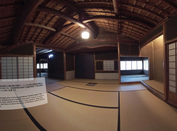 )は道具を飾る二畳中板の空間で、ここからはるか佐渡島が望めるため「佐度看の間」と命名されました。庭匠田中泰阿弥の設計で当館の茶会「三楽山茶会」では薄茶席として使われることの多かった茶室です。