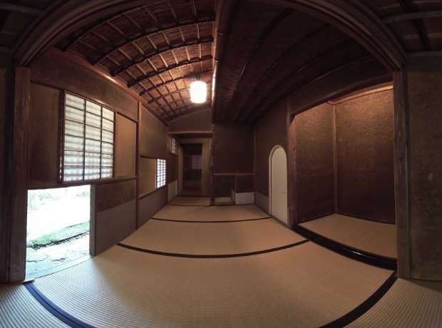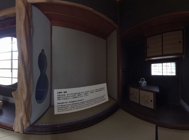 世にも奇なる正三角形の小亭で建坪11坪余の書斎兼茶室です。柱、建具、畳の殆どが三角形や菱形等で、この独創的な建物は大店