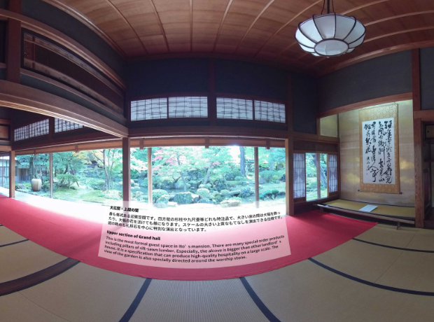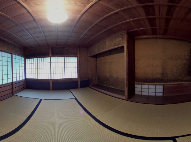 美しい庭園に面した座敷は冠婚葬祭など、特別な行事に年に数回使われました。大玄関は柱、天井、式台から戸に至るまで全て欅造りです。特に式台と戸は一枚板を使用、雨戸26枚が収まる戸袋や、座敷を囲む廊下には柱が一本もない釣欄間など、全てが贅を尽くした造りになっています。床の間を挟んで7つの部屋があり、畳の数は全部で100枚にも及びます。