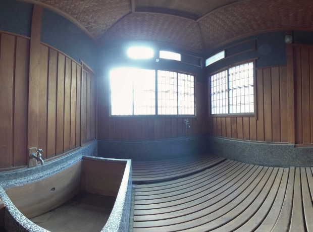 東本願寺の門首も入浴した来賓用の風呂場です。庭園の茶室の一つのような数寄屋造りが見所です。腰板や天井、戸袋まで多彩な組み方の網代を用い、足元は円弧状の杉板が敷かれ、土踏まずの感触が疲れを癒します。隅にはシャワーもあります。