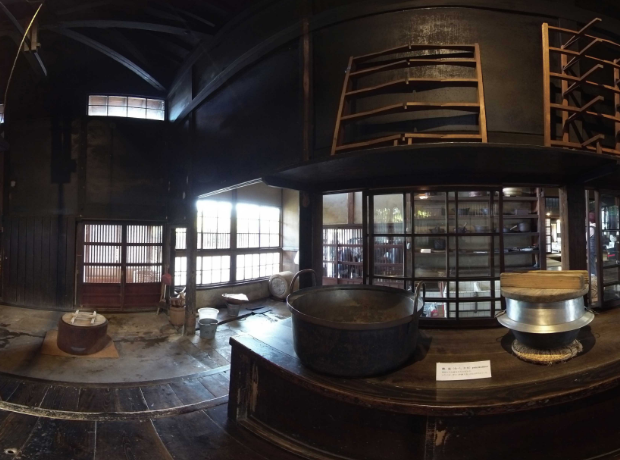 当時、50人余の従業員が働いており、台所にある竈で60㎏(1俵)の米を毎朝炊いていました。また、六尺(1.8m)四方の囲炉裏には一度に16人が座ることができます。