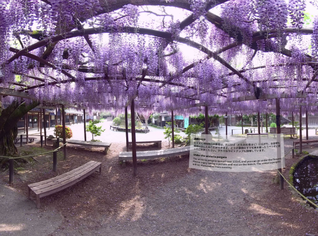 藤は樹齢150年といわれ、「伊藤」の名字にもあることから、北方文化博物館のシンボルです。5月上旬から中旬頃に鮮やかな見頃を迎え、辺りはその甘い香りで包まれます。